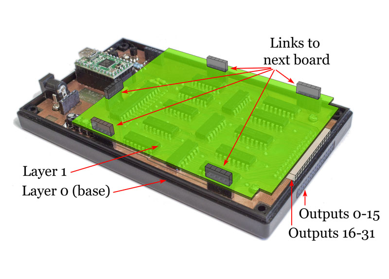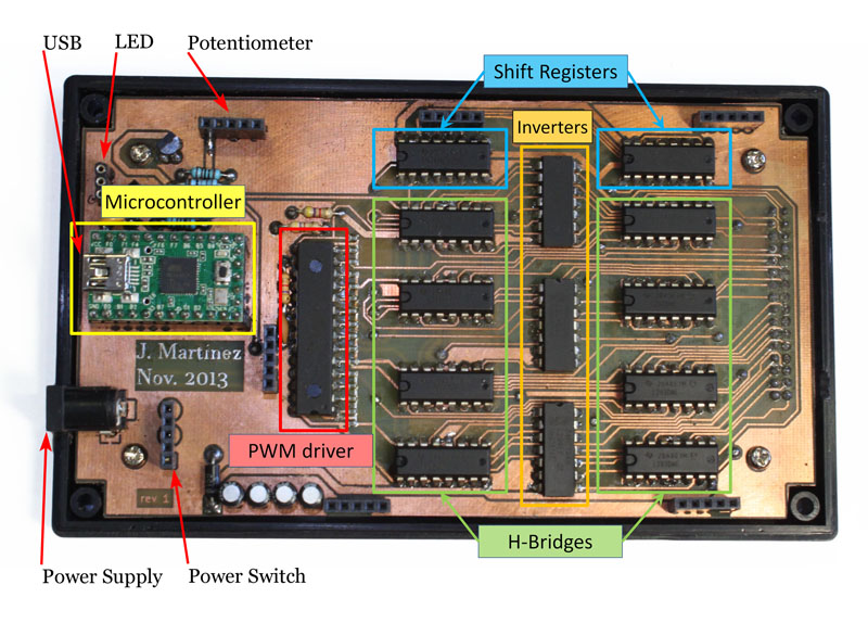 The electronic controller is built around a Teensy 2.0 AVR controller, powered by an Atmel ATmega32u4 chip. The controller provides 16 outputs, but it has been designed to be scalable, so new layers can be efficiently stacked on top of the PCB to support more outputs. Aside from this, one of the main features is the ability to perform overdrive and active braking to improve the response of ERM actuators. A programmable knob has been added to the last prototype, which is usually used by the users to adjust the vibration intensity to their preferences.